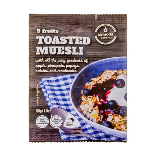 Introducing the newest addition to the Serious Cereal range, 5 Fruits Toasted Muesli. This delicious toasted muesli is loaded with apple, pineapple, papaya, raisins and cranberries. Rich in fiber and whole grain goodness, it really is a great tasting way to start your day.