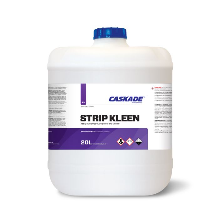 Strip Kleen is a powerful degreaser capable of removing the baked deposits, fats, oils and waxes encountered in food processing, frying operations and rendering areas. Strip Kleen is a powerful alkaline cleaner containing over 20g/L Sodium Hydroxide, boosted with ammonia and solvents to provide exceptional grease cutting ability. Strip Kleen removes smoke deposits from fires and vehicle exhausts easily, to provide benefits for vehicle cleaning and pollution removal. It may also be used for filter cleaning and for stripping zinc cross-linked polishes from vinyl flooring. Strip Kleen is inhibited against aluminium attack but aluminium should not be soaked in solutions of Strip Kleen nor should Strip Kleen be used on zinc, cadmium, anodised or galvanised surfaces. Some painted surfaces may be sensitive to strong solutions of Strip Kleen - particularly sign writing on the curtain sides of vehicles.