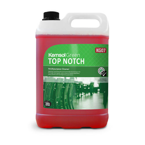 TOP NOTCH is a degreasing and heavy -duty yet environmentally accredited cleaner for the tough cleaning jobs, such as those on heavily soiled floors, walls, benches and most degreasing applications. Meets or exceeds EU biodegradability standards and meets Kemsol Green environmental standards and is Environmental Choice licensed. Available in 5L