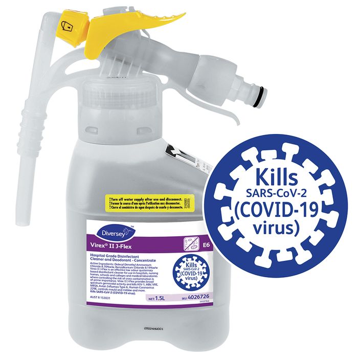 Concentrated neutral quaternary-based hospital grade disinfectant for use in hospitals and other facilities. Designed for light cleaning, disinfecting and controlling mould and mildew on hard, non-porous inanimate surfaces. Massive 1:256 dilution - each bottle makes 385 litres of product The J-Flex system brings you: 1) Accurately dosed concentrated products The unique dosing head incorporated into the J-Flex pack is specially calibrated for each product and ensures the right solution is available for use every time 2) Versatility and flexibility Because the J-Flex unit delivers two levels of water flow, the same product can be used in spray bottle and bucket applications. The simple plug in hose connector makes the system truly portable 3) Absolute reliability The J-Flex system is unique in that the entire dilution control unit is disposable. This effectively elimanates the risk of breakdown or inaccurate dosing due to poor maintenance that may occur with a reusable dispensing unit 4) Simplicity and safety in use with its simple hose connections, colour coded labels with clear application icons and dilution symbols.