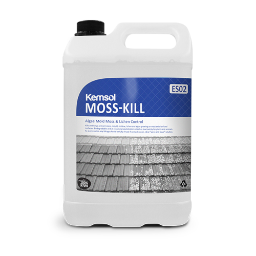 Kemsol Mosskill will kill and prevent moss, mould, mildew, lichen and algae growing on most hard surfaces. Mosskill is biodegradable. Mosskill has low toxicity for plants and animals. But as a precaution any foliage should be fully rinsed if contact occurs. An ideal “Spray-on and leave” solution for controlling moss, mould and algae. Can be used by itself or as a “preventative” program after water blasting. Has a residual action that can prevent the activation of moss and mould spores for up to 12 months. With a foaming base it allows applicators to see where they have applied the product to ensure complete surface coverage.