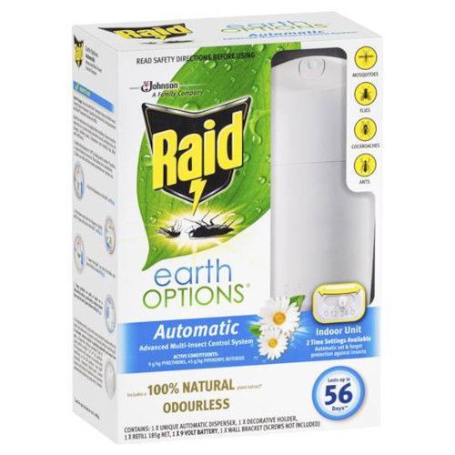 Raid Earth Options Automatic Advanced Multi Insect Control System with Natural Pyrethrins is designed for continuous protection against flying and crawling insects. Pyrethrins are extracts from chrysanthemum daisies, which are natures own protection against insects. These extracts are used to control most common insects like flies, mosquitoes, ants & cockroaches.