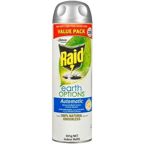 Raid Earth Options Automatic Advanced Multi Insect Control System with Natural Pyrethrins is designed for continuous protection against flying and crawling insects. Pyrethrins are extracts from chrysanthemum daisies, which are natures own protection against insects. These extracts are used to control most common insects like flies, mosquitoes, ants & cockroaches.