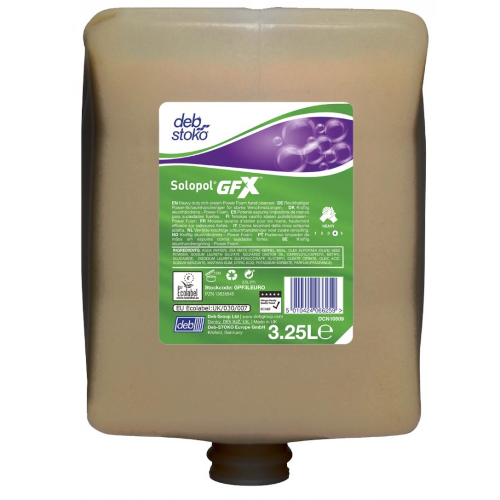 Deb Solopol GFX Gritty Power Foam Soap is the worldâs only heavy duty gritty POWER FOAM hand cleanser. Lightly fragranced solvent free formulation with non-abrasive cornmeal and olive pit scrubbing agents. The rapid and powerful deep-cleansing action, combined with excellent skin feel during and after use, ensures high user satisfaction.