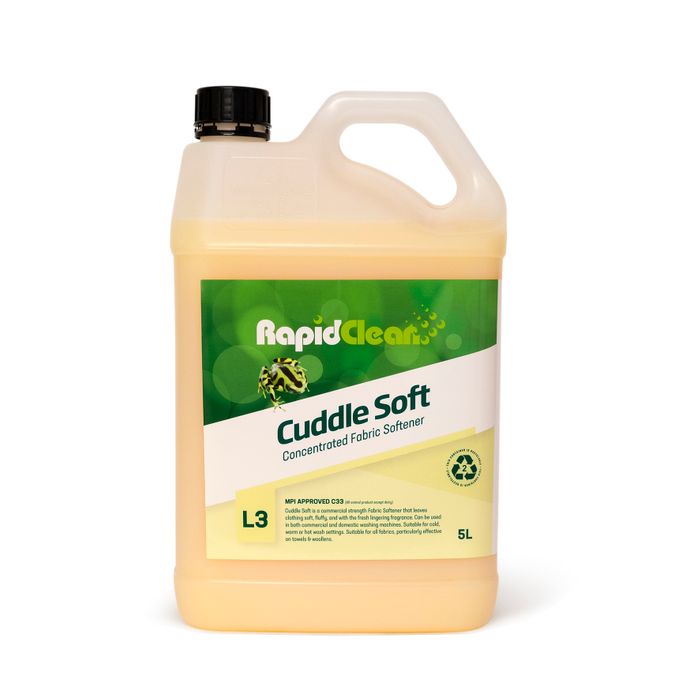 RapidClean Cuddle Soft Fabric Softener performs two roles in one operation softens fabrics as well as eliminating static charge. Cuddle Soft is used during the final rinse cycle after the laundering of towels and bed linen and to reduce the static cling in polyester and other synthetic garments. Cuddle Soft leaves fabrics fragrantly fresh, easy to iron and wrinkle free.