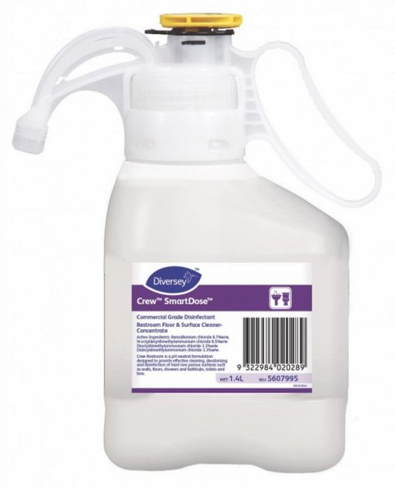 Non-acid restroom disinfectant cleaner that cleans, disinfects and deodorizes bathroom surfaces in one step.Cleans and disinfects hard, nonporous surfaces, removing common soils without residue. No rinsing required for non-food contact surfaces. Crew Smartdose is effective in hard water.