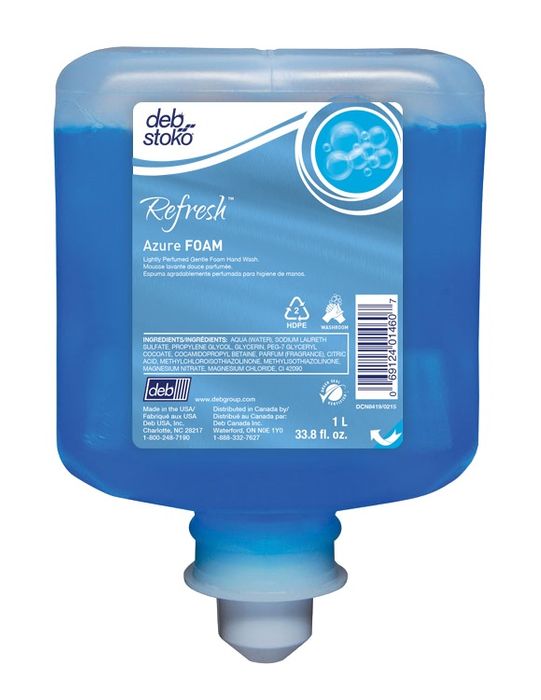 Choose this Refresh Azure Foam Soap Cartridge 1 Litre for a pleasant, high quality foaming soap that's great for day to day use. The silky smooth formulation has a fresh, universal fragrance suitable for males and females. Contains skin moisturiser Glycerin to enhance skin health, improve hydration and prevent drying. Great for use in education, early childhood, offices, food handling, healthcare and aged care environments. This cartridge is for use with the Deb Stoko Cleanse Washroom Dispenser.