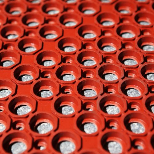 Terracotta grease resistant rubber. Free draining for wet areas. Safe with a non-slip pattern. Anti-fatigue. Safety ramped edging. Light weight and easy to move for cleaning. 13mm Thick. Comfort - 4/5. Grip - 5/5. Wear - 4/5. Resistance to oil/grease - 4/5.