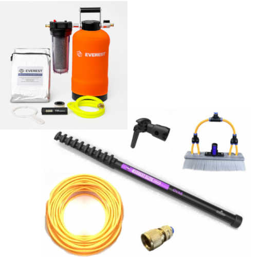 This is the perfect solution for cost-effective and efficient window cleaning, solar panel washing, and exterior building washing. This kit includes a 10L blue fibreglass tank, 10L deionized resin, a 12.2m OVA8 carbon pole Kit with 8 sections and a TDS meter.