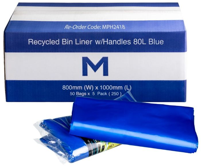 - 80L BLUE FP RECYCLED RUBBISH BAGS WITH HANDLES 50S - 800MM X 1000MM X 40MU